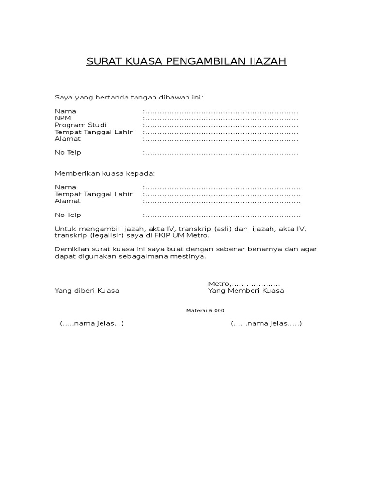 Dan mereka biasanya di titipkan teman seanggkatan kuliahnya dengan alasan yang lebih tau akan keberadaan tempatnya. Berikut di bawah ini salah satu contoh surat kuasa pengambilan ijazah yang biasa digunakan para mahasiswa yang tidak dapat. Kumpulan contoh surat kuasa tanah word yang baik 2019. Untuk mengambill ijazah asli, transkip nilai serta semua fotokopi yang sudah dilegalisir atas nama yang memberikan kuasa dan menandatangani semua surat yang berkaitan dengan pengambilan ini. Surat kuasa ambil ijazah doc 1. Contoh surat kuasa pengambilan ijazah di tempat kerja. Adapun contoh surat kuasa misalnya seperti: 15 ed 13611011291 tanggal lulus : Untuk anda membutuhkan file download surat kuasa ini secara lengkap dalam bentuk format doc (word) atau pdf. Surat kuasa saya yang bertandatangan di bawah ini : Yang bertanda tangan di bawah ini : Really is endless you are all enjoy and lastly will get the best picture from our collection that placed here and also use for ideal needs for personal use. Atau bisa juga di ambilkan oleh sanak keluarganya.